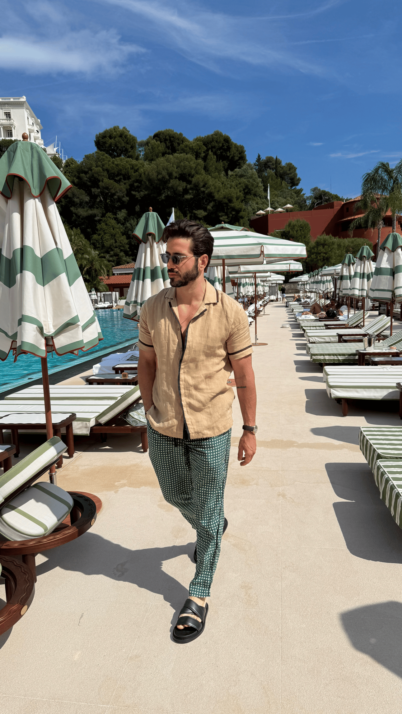 This look has the staples all men need: a simple breathable button-down, light linen pants, and a pair of sunglasses that fit your face.